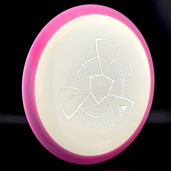Mayhem has a responsive straight-stable profile and plenty of speed, making it a perfect workhorse driver for many advanced and expert throwers. Like the MVP 23mm class, the Mayhem has a pronounced dome to promote distance-covering glide. Mayhem is best compared to a beat MVP Octane.