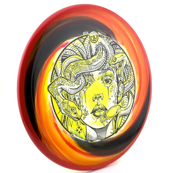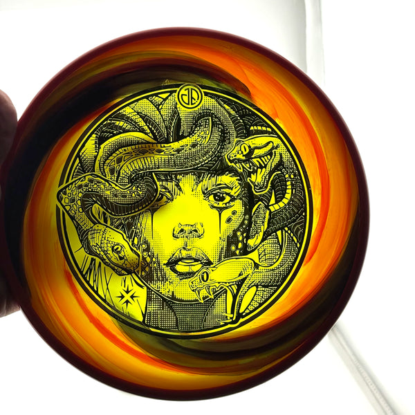 The "Medusa" stamp on DFX discs was designed by artist John Dorn. This design is part of the Mythix series from DFX Discs.