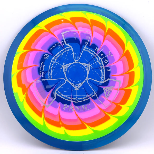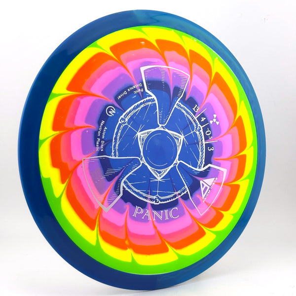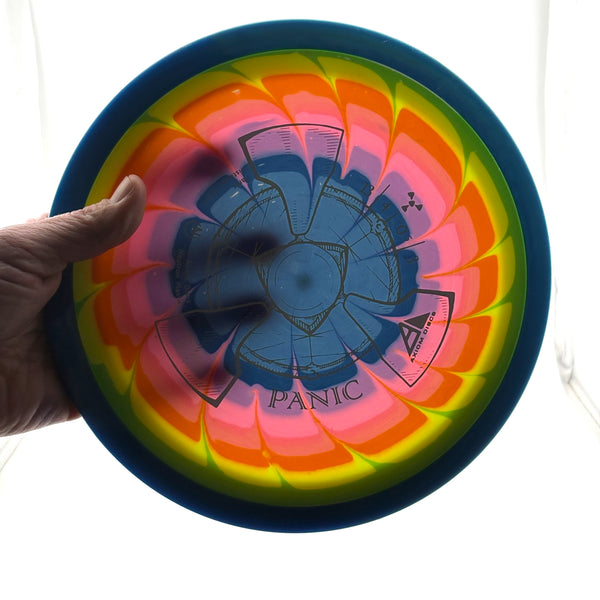 The Panic is thoroughly overstable, with plenty of beef to handle headwinds and torqued-up sidearms. Its overstability holds the Panic on any kind of hyzer line and allows steep anhyzer flex shots. For high-power throwers, the Panic will be a useful utility driver, while newer and average throwers will get an extremely overstable flight. The Panic is best described as a seasoned MVP Nitro.