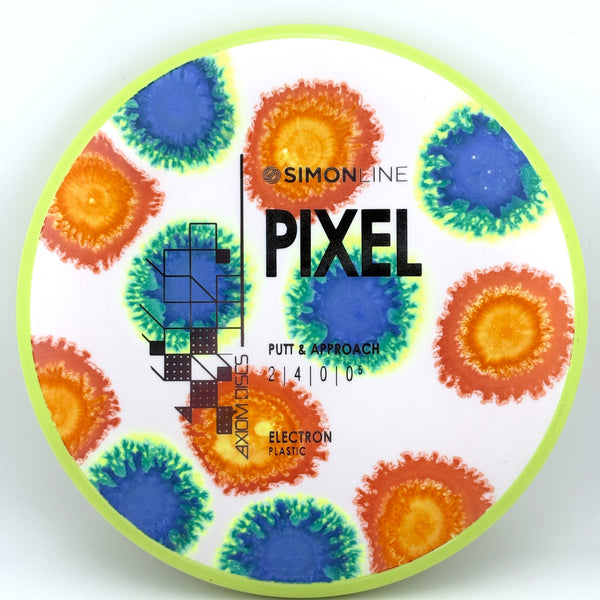 Axiom says this about the Pixel: "The second disc in the Simon Line is officially here, the Electron Pixel! Debuting with flight numbers of 2 | 4 | 0 | 0.5, the Pixel has a deep profile with a small micro bead, perfect for getting that full grip feeling. Off the tee, the Pixel is a straight/stable flier and will reliably hold any line it’s thrown on with a minimal amount of fade back. However, don’t let the low speed fool you—the Pixel can certainly go the distance, especially with the right wind conditions. On the putting green, whether you’re in C1 or C2, the Pixel shines with the right amount of glide to carry right into the chains."